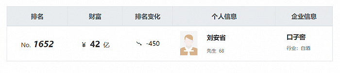 《2021胡润百富榜》显示,刘安省以42亿的财富位列第1652名。今年6月上旬,口子窖实施2022年分红方案,刘安省拿走1.05亿元。