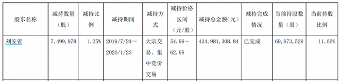 2020年,刘安省再次减持7,499,978股,套现4.35亿元。