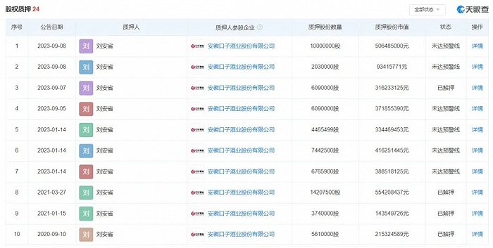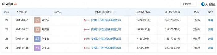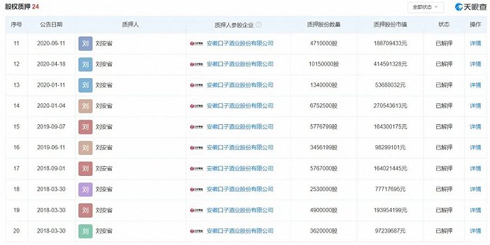 2018年2月,质押给如日中天的17,999,092股解除。一个月后,他又将27,010,000股质押给海通证券。4月,又向海通资管质押了10,150,000股。8月,口子窖解禁潮来临,随之而来的就是原始股东的减持潮,刘安省也减持了2,399,943股,套现9302.16万元。