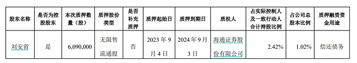 但在2022年9月7日,刘安省将上述股份质押展期一年,展期后的购回交易日为2023年9月27日。到了2023年9月7日,刘安省又将质押展期一年,展期后的购回交易日为2024年9月26日。