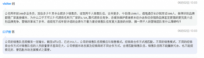 在口子窖今年6月举行的2022年度业绩说明会上,有投资者质问口子窖的业务员人数为何与迎驾、古井、今世缘和酒鬼酒相差甚远?并指出口子窖营销改革说了多年,但销售队伍建设不力。