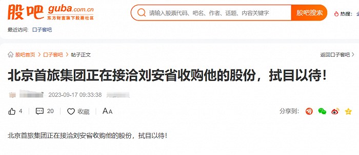 另有股吧网友提到,“北京首旅集团正在接洽刘安省收购他的股份”。「界面新闻·子弹财经」询问北京首旅方面,对方表示“还没听到这回事”。