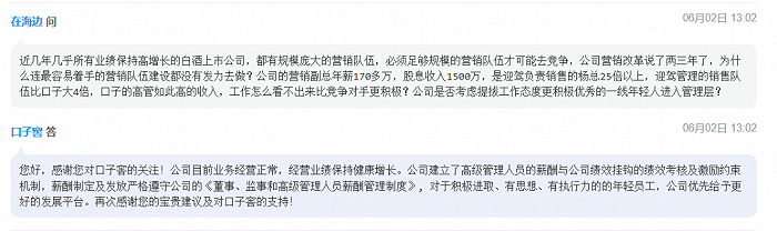 更有投资者直接“开炮”:“公司的营销副总年薪170多万,股息收入1500万,是迎驾负责销售的杨总25倍以上,迎驾管理的销售队伍比口子大4倍,口子的高管如此高的收入,工作怎么看不出来比竞争对手更积极?”