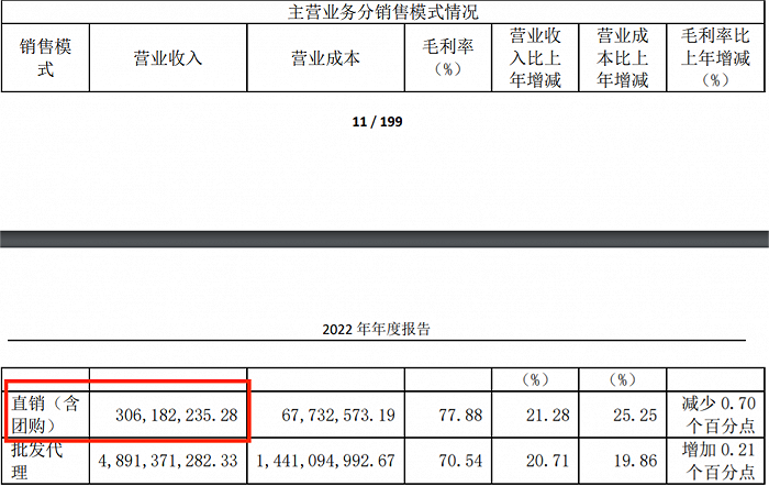 根据2022年年报,口子窖批发代理营收达49.73亿元,直销(含团购)营收仅8659.78万元。而劲敌迎驾贡酒同期直销(含团购)营收达3.06亿元。
