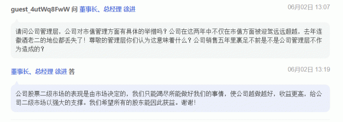 心急如焚的投资者甚至发出质问:“公司对市值管理方面有具体的举措吗?公司在这两年中不仅在市值方面被迎驾远远超越,去年连徽酒老二的地位都丢失了!你们认为这意味着什么?公司销售五年里裹足不前是不是公司管理层不作为造成的?”