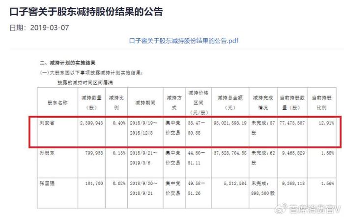 2019年3月,口子窖发布了关于股东减持股份结果的公告。刘安省通过集中竞价交易,累计套现9302.16万元。