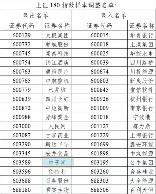 11月29日,上交所公告致指出,根据指数规则,经指数专家委员会审议,上海证券交易所与中证指数有限公司决定调整上证50、上证180、上证380、科创50等指数样本,于2024年12月13日收市后生效。其中上证180指数更换18只样本。调出名单中,安徽名酒口子窖在列。