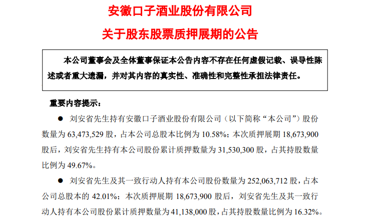 1月10日,口子窖发布公告,公司实控人之一的刘安省将1867万股质押股份办理了展期。至此,其已经累计质押了3153万股,占其所持股份的49.7%,即约半数已经质押。