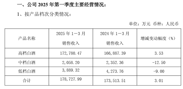 公司今年一季度经营数据显示,高档白酒占到白酒收入的约96.67%。