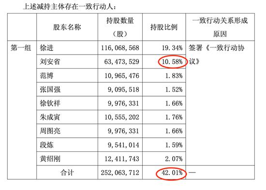 这些股权结构并非孤立存在,而是嵌入一个更为庞大的控制网络中。公告披露,刘安省与徐进、范博、徐钦祥等8人构成一致行动人关系。