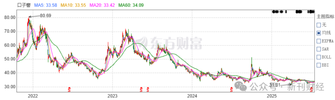 市场数据显示,口子窖当前股价表现较为疲软,截至7月18日收盘价33.73元已跌至历史低位区间,且近期均处于该水平徘徊。与2021年末80.59元的高点相比,股价累计跌幅达58.15%。虽然2023年曾一度反弹至71.77元,但随后又开启下行通道,至今累计回落约53%。在此背景下,大股东选择此时减持的时点安排值得市场关注。