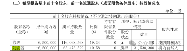 值得关注的是,刘安省当前持有的6347万余股中,有3153万股处于质押状态,质押比例接近五成。持续减持叠加高比例股权质押,或反映出该股东可能存在资金周转需求,可能对公司股权结构的稳定性产生不利影响。