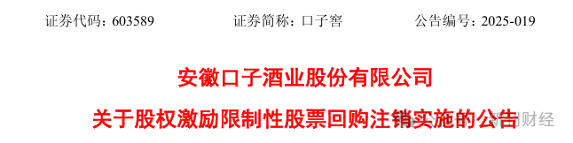 口子窖同日另一则公告显示,因2023年限制性股票激励计划第二个解锁期业绩未达标,公司拟于7月23日集中回购并注销合计188.05万股限制性股票。其中,一半数量对应第二期应解锁却未能解锁的94.03万股;另一半则依据激励计划“变更与终止”条款,将剩余已授出但尚未解锁的94.03万股一并回购注销。注销完成后,公司限售股将全部清零,总股本相应由6.00亿股缩减至5.9812亿股。