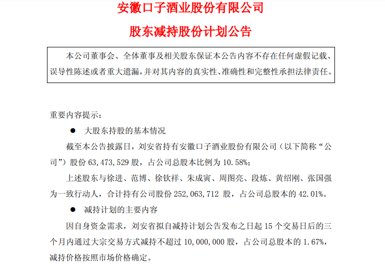 公告显示,因自身资金需求,口子窖实际控制人之一的刘安省计划通过大宗交易减持公司不超过1000万股,占公司总股本的1.67%。