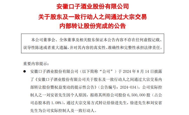 《财中社》发现,2024年9月,口子窖公告,因个人原因,刘安省将其所持公司股份650万股即公司股本的1.08%转让给徐进。通过转让,徐进持股增加,刘安省获得转让款2.2亿元。