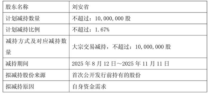 公告显示,持股10.58%的大股东刘安省计划减持不超过1000万股公司股份,占公司总股本的1.67%,减持期间为2025年8月12日至11月11日,减持方式为大宗交易减持,减持理由是“自身资金需求”。