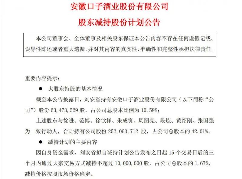目前,刘安省共持有约6347.35万股口子窖股票,持股比例为10.58%,其与徐进、范博、张国强等8人为一致行动人,合计持有公司股份2.52亿股,占公司总股本的42.01%。其中徐进持股比例最高,为19.34%,刘安省第二,黄绍刚持股比例为2.07%排第三。