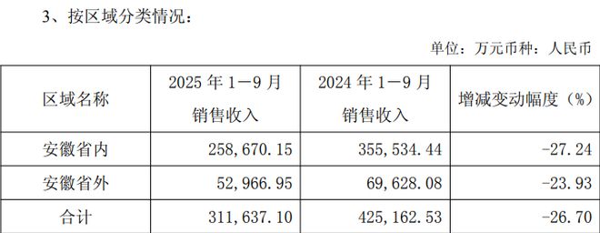 作为典型区域酒企,口子窖的全国化布局虽在积极推进,但安徽省内市场仍是其绝对核心。不过,2025年前三季度,口子窖省内收入同样出现下滑,省内市场实现营收约25.87亿元,同比下滑27.24%。此外,省外市场收入同比下滑23.93%至5.3亿元。