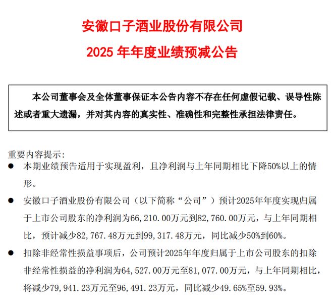根据口子窖发布的公告显示,其预计2025年归母净利润为6.62亿元-8.28亿元,较上年同期预计减少8.28亿元-9.93亿元,同比减少50%-60%。同时,预计扣非后净利润为6.45亿元-8.11亿元,同比减少49.65%-59.93%。