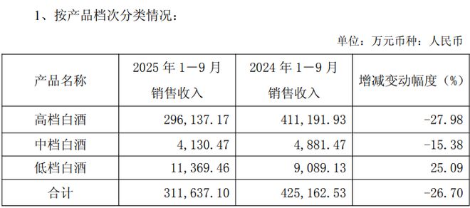 分产品来看,前三季度,口子窖的中高档白酒均出现销售收入下滑。其中,公司高档产品实现营收29.61亿元,同比下滑27.98%,降幅最大;中档产品实现营收4130.47万元,同比下滑15.38%;低档产品实现营收1.14亿元,同比增长25.09%。
