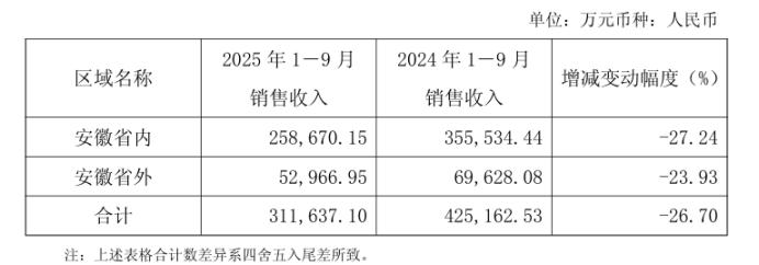 现实却是,口子窖的省外收入持续萎缩。2024 年,其安徽省外市场收入约 9.20 亿元,同比减少 2.88%。2025 年前三季度,安徽省外市场实现销售收入约 5.3 亿元,同比下降 23.93%。
