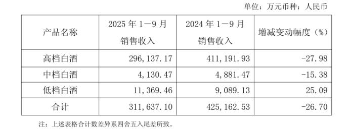 高端白酒业务一直是口子窖的核心收入来源,但这一支柱在 2025 年前三季度出现显著动摇。期内,其高档白酒产品收入仅为 29.61 亿元,同比大幅下滑 27.98%。