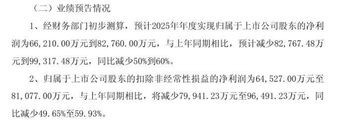 近日,口子窖发布《2025 年年度业绩预减公告》。口子窖预测,2025 年其归属于上市公司股东的净利润为 6.62 亿至 8.28 亿元,同比减少 50%到 60%;归属于上市公司股东的扣除非经常性损益的净利润为 6.45 亿至 8.11 亿元,同比减少 49.65%至 59.93%。