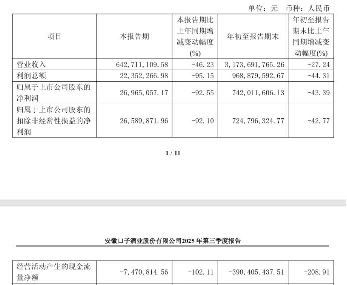 2025 年第三季度,口子窖实现营业收入约 6.43 亿元,同比大幅减少 46.23%;归属于上市公司股东的净利润约 2696.51 万元,同比减少 92.55%,创下上市以来单季最大跌幅。