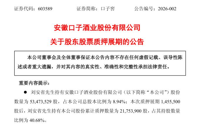 刘安省目前的股权质押情况也备受关注。根据口子窖近期公告,刘安省于 1 月 9 日将其持有的 145.55 万股股份办理质押展期,到期日延至 2027 年 1 月 8 日,资金用途为偿还债务。截至披露日,刘安省个人持股 5347.35 万股,占公司总股本 8.94%,其中累计质押 2175.39 万股,质押比例已达 40.68%。