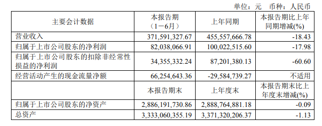 8月1日晚间,康辰药业发布了半年报,公告显示其上半年营业收入为3.72亿元,同比下降18.43%;归母净利润为0.82亿元,同比下降17.98%,扣非后0.34亿,同比下降60.6%。