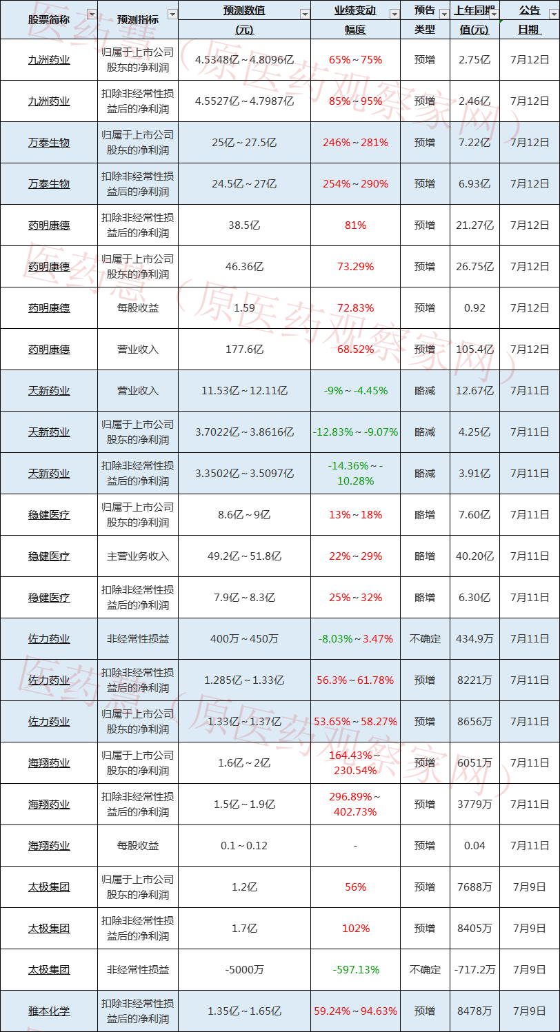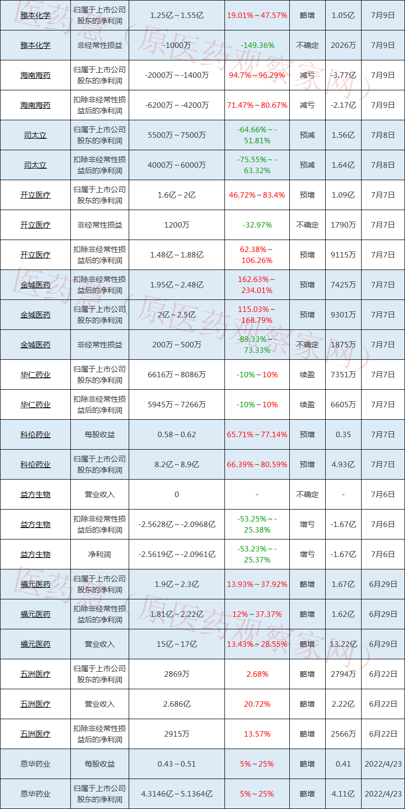 另据医药慧不完全统计,7月以来还有19家药企披露了2022年年中业绩预告。