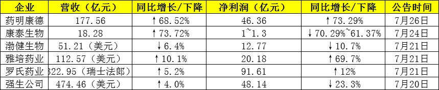 七月份,药明康德、康泰生物、渤健生物、雅培药业、罗氏药业、强生公司也发布了半年报。