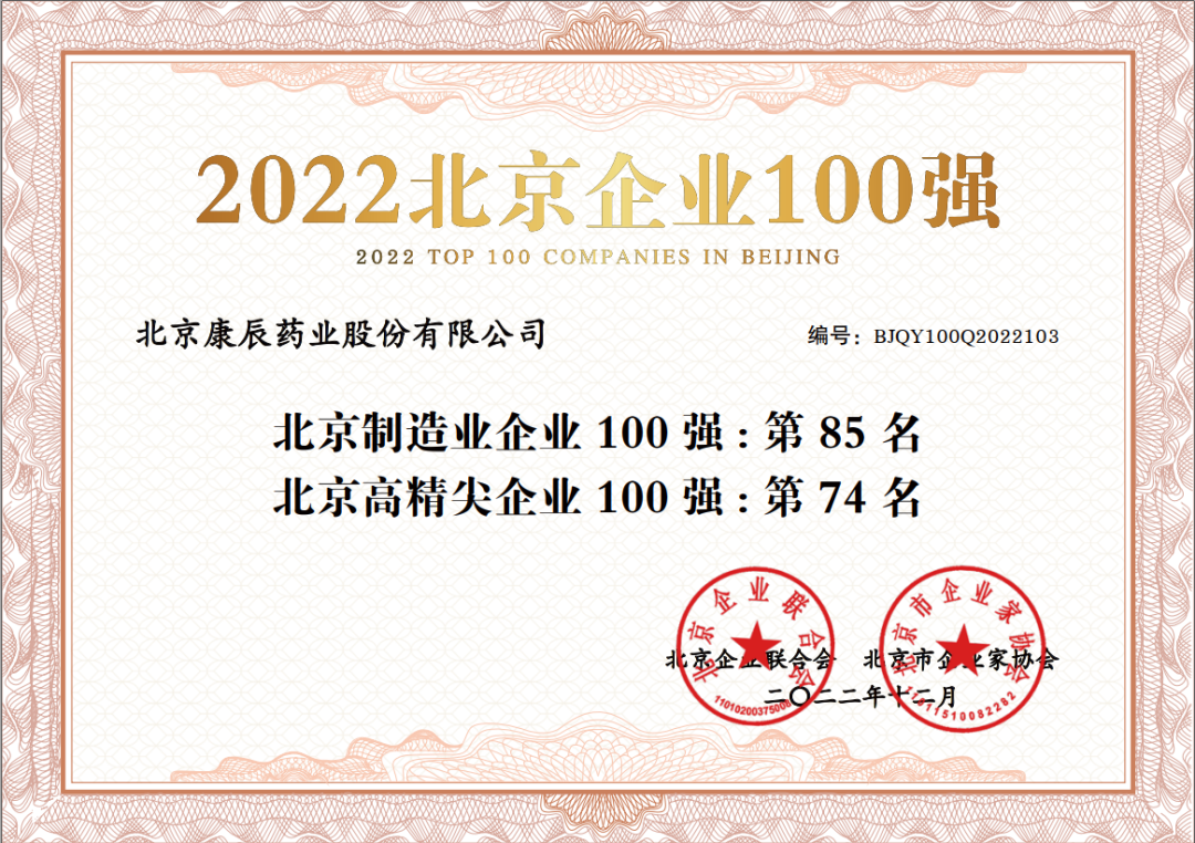 近日公司收到北京企业联合会与北京市企业家协会颁发的“2022北京企业100强”证书,康辰药业荣获北京制造业企业100强及北京高精尖企业100强。
