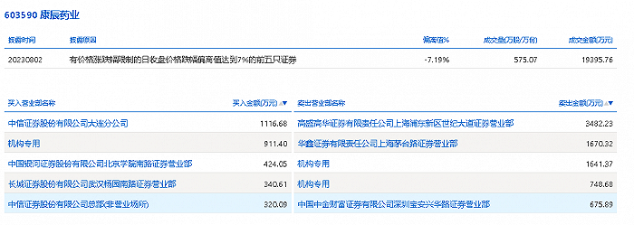 8月2日,康辰药业今日跌8.08%,龙虎榜数据显示,上榜营业部席位全天成交1.13亿元,占当日总成交金额比例为58.42%。其中,买入金额为3112.83万元,卖出金额为8218.5万元,合计净卖出5105.67万元。