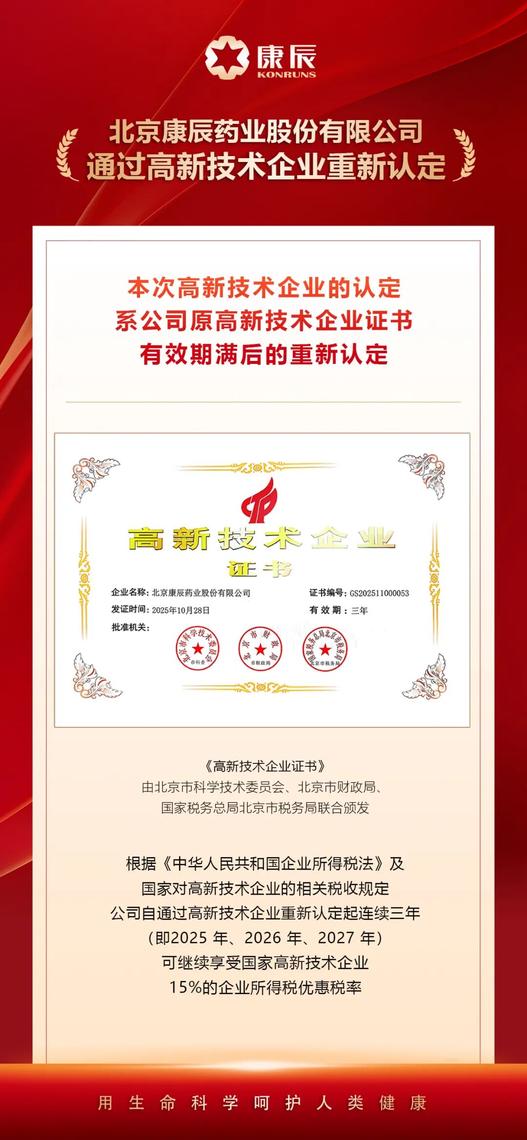 北京康辰药业股份有限公司通过高新技术企业重新认定!