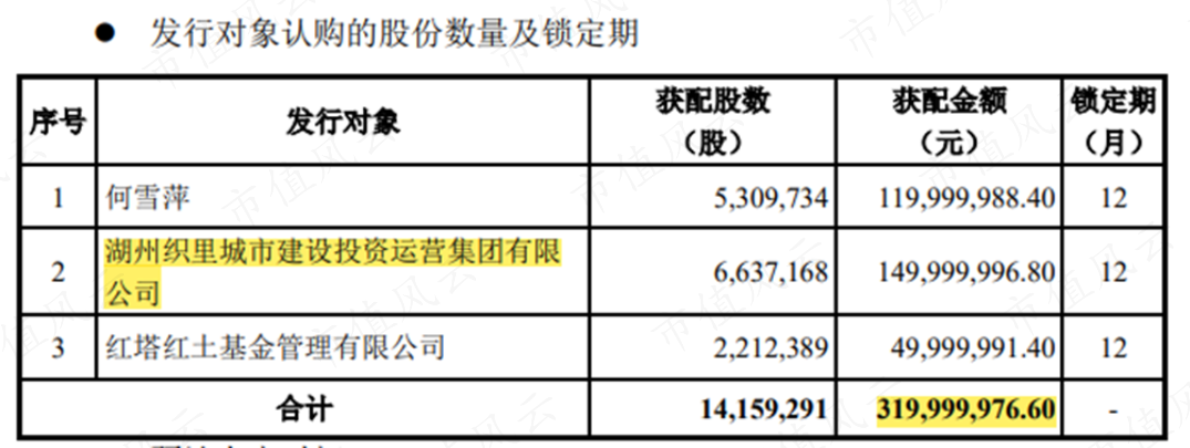 其中,湖州织里城市建设投资运营集团有限公司,是湖州市吴兴区国资的全资孙公司,拿出了1.5亿资金用于定增。
