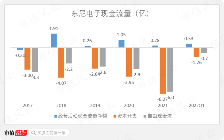 与此同时,东尼电子的现金流量也十分紧张,其自由现金流已经连续五年为负。
