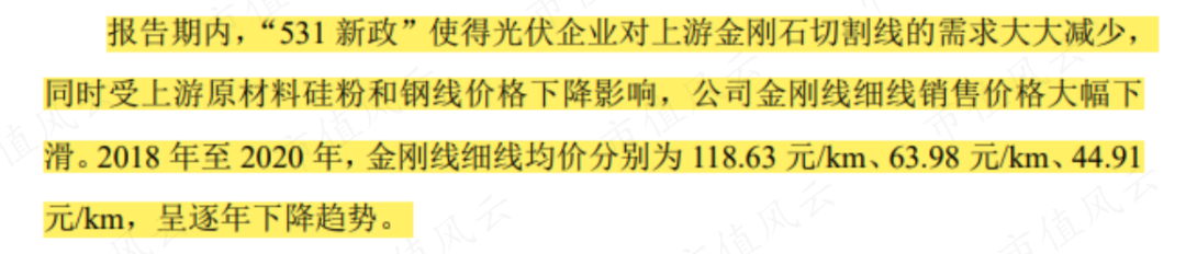 从公司的解释来看,东尼电子这波业绩打骨折,和光伏行业遇冷有关。2018年,“531新政”使得光伏企业对上游金刚石切割线的需求减少,价格也大幅下滑。