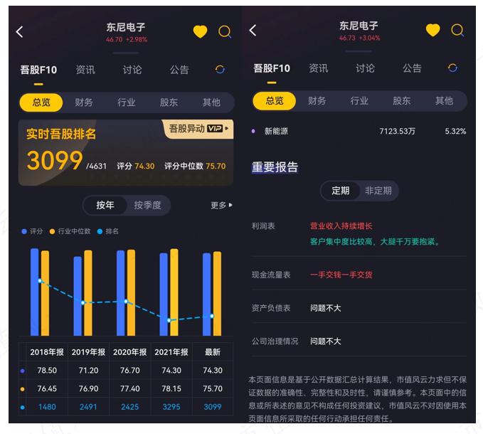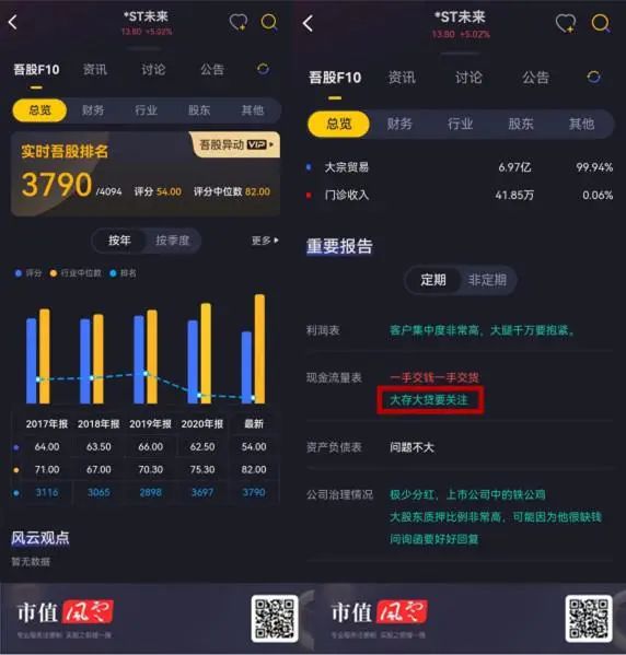 打开市值风云APP,*ST未来的吾股排名3790,妥妥的差生。在总览一栏,吾股大数据也早已提示“大存大贷要关注、客户集中度非常高、大股东质押比例极高”等风险。随着市值风云APP越来越智能便捷,打开吾股F10一栏,就能对公司的成色了解个大概。