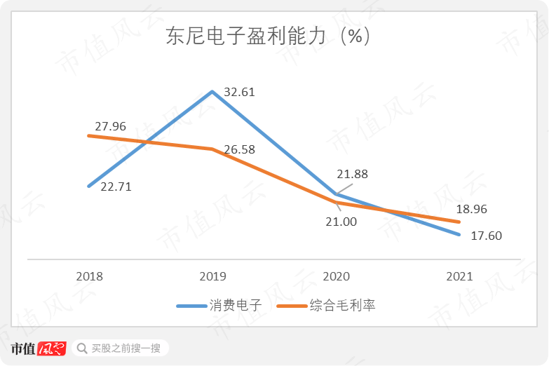 2018年-2021年,东尼电子的消费电子业务毛利率经历了先增长、后持续下降的过程。
