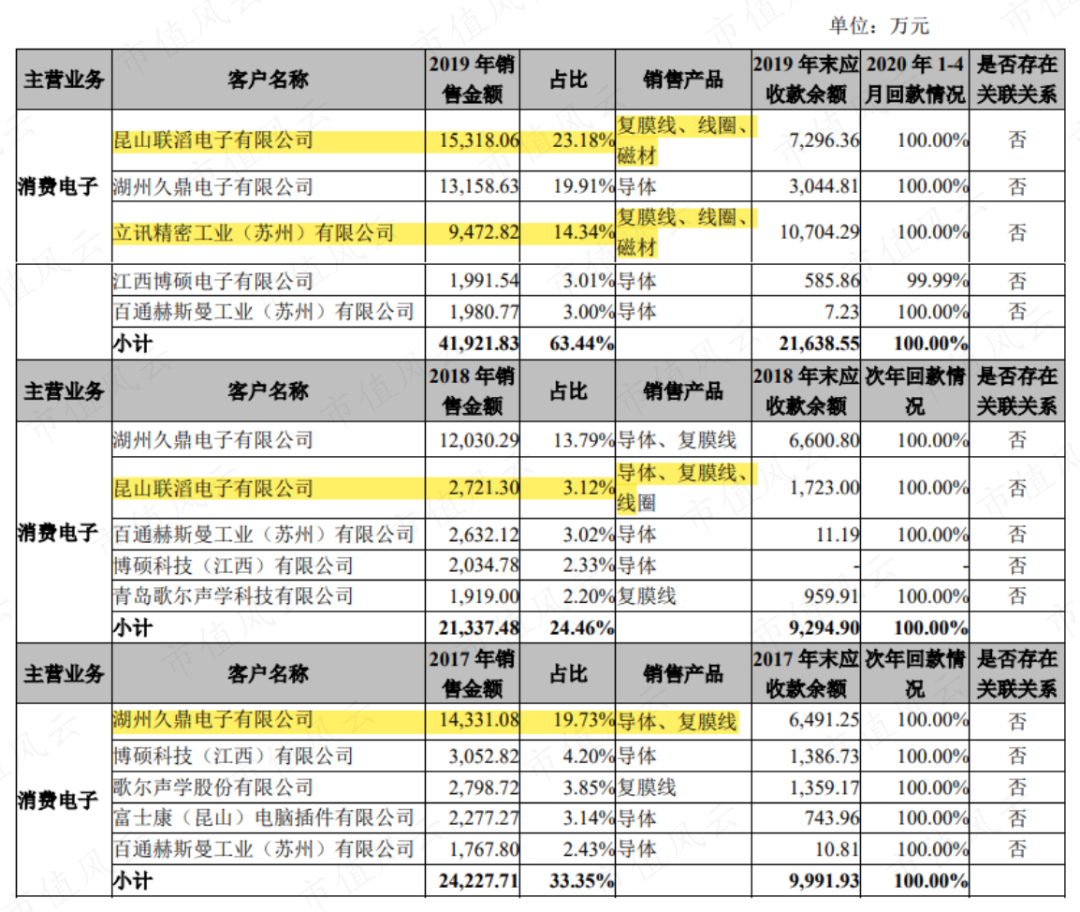 2019年,东尼电子消费电子领域的前三大客户中,昆山联滔电子有限公司、立讯精密工业(苏州)有限公司均为立讯精密的全资子公司,另外一家湖州久鼎电子有限公司,立讯精密也间接持有其30%的股权。