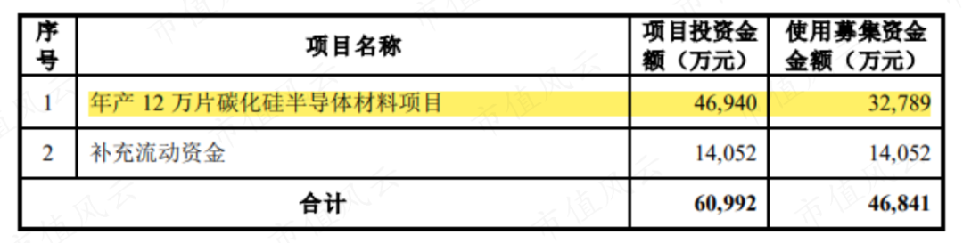 半年后,东尼电子最终以24元/股的价格募资4.68亿,其中3.28亿用于“年产12万片碳化硅半导体材料项目”,另外1.41亿用来补充流动资金。
