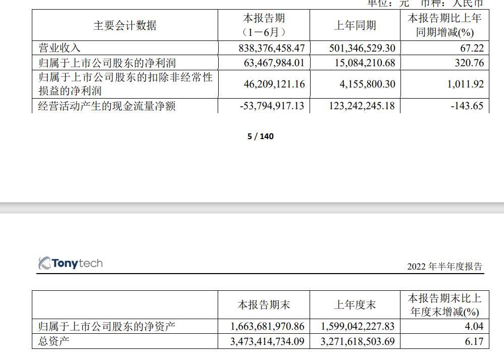 东尼电子8月26日晚间发布2022年半年度业绩报告称,公司上半年营业收入8.38亿元,同比增长67.22%;归属于上市公司股东的净利润6346.8万元,同比增长320.76%;归属于上市公司股东的扣除非经常性损益的净利润4620.91万元,同比增长1011.92%。