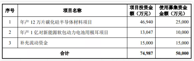 东尼半导体于2021年4月非公开发行募投项目“年产 12 万片碳化硅半导体材料”,该项目非公开发行募集资金总额约为4.68亿元,项目全部投产后将形成年产12万片SiC的产能。