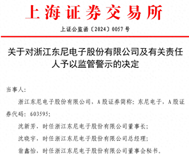 回看监管函,鉴于前述违规事实和情节,根据《股票上市规则》和《上交所纪律处分和监管措施实施办法》等有关规定,上交所作出如下监管措施决定:对东尼电子公司及时任董事长沈新芳、总经理沈晓宇、董事会秘书翁鑫怡予以监管警示。