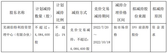 昨日晚间,伯特利(证券代码:603596)发布公告称,股东芜湖伯特利投资管理中心(有限合伙)(以下简称“伯特利投资”)计划通过集中竞价方式进行减持公司股份不超过4,084,600股,占公司总股本的1%,将于减持计划公告之日起15个交易日之后进行,减持计划结束日期为2022年10月18日,在任意连续90个自然日内股东伯特利投资通过集中竞价交易方式减持股份的总数不超过公司股份总数的1%。减持计划将于公司回购方案实施完成后进行。一致行动人大股东袁永彬(YUAN,YONGBIN)在上述减持期间内不通过此方式进行减持。