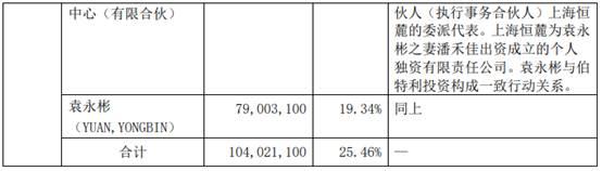 公告显示,袁永彬是伯特利投资的普通合伙人(执行事务合伙人)上海恒麓的委派代表。上海恒麓为袁永彬之妻潘禾佳出资成立的个人独资有限责任公司。袁永彬与伯特利投资构成一致行动关系。