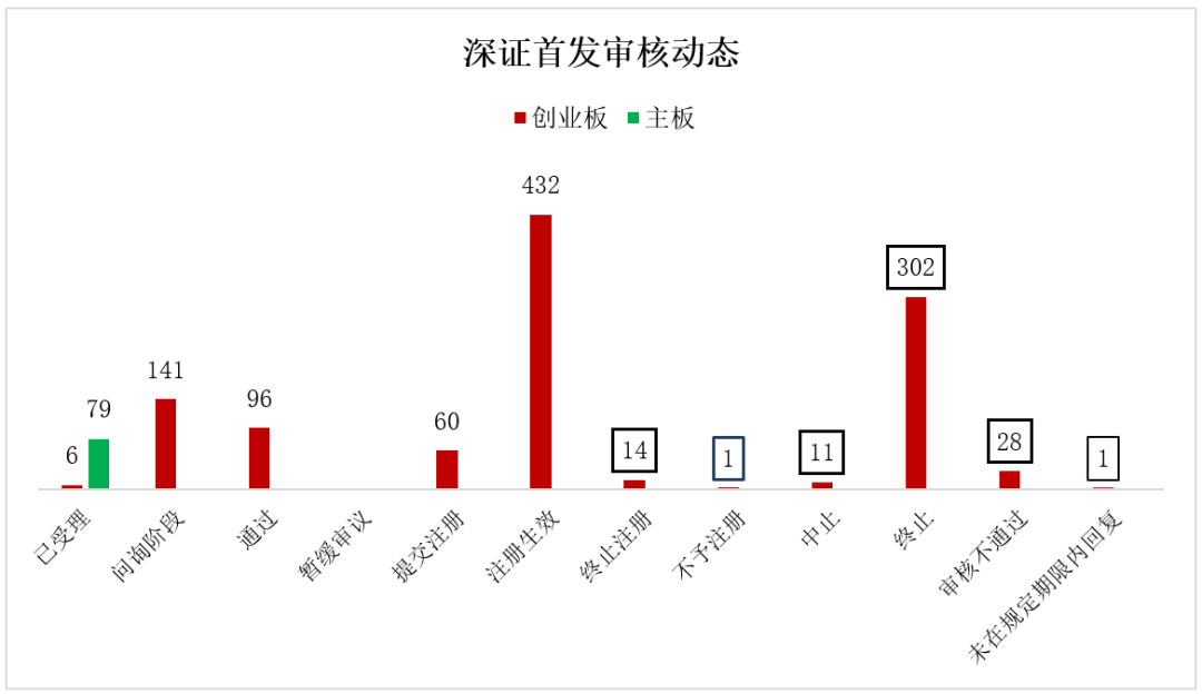 深交所信息显示,截止3月3日下午4时,深交所累计受理1142家企业的首发申请(主板79家,创业板1063家),从审核状态来看,其中处于受理阶段85家,问询阶段的有141家,96家近期通过上市委会议。过会企业中,60家提交注册中,432家注册生效,14家终止注册,1家不予注册,另有11家中止审核,302家终止(273家撤回材料)。