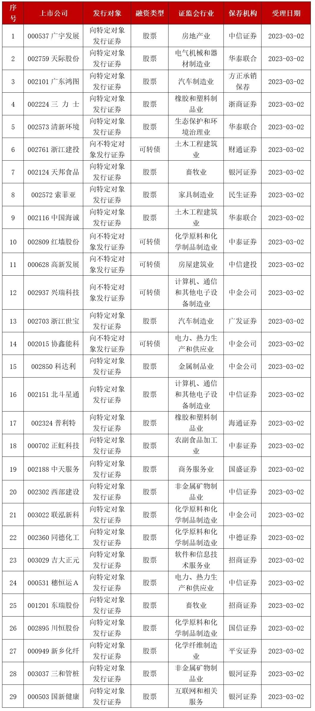 昨日至今,主板再融资新增受理广宇发展等29家企业。