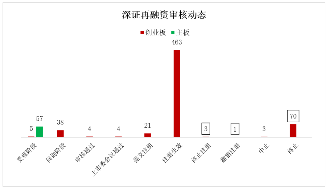 再融资方面,深交所累计受理669家企业的再融资申请(主板57家,创业板612家),目前处于受理阶段62家,问询阶段的有38家,审核通过4家,上市委会议通过4家,提交注册21家,注册生效463家,撤销注册1家,终止注册3家,中止3家,终止(撤回)70家。